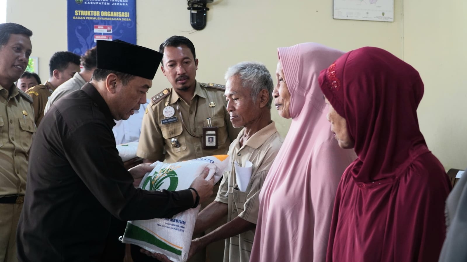 SKI|Jepara – Penjabat Bupati Jepara Edy Supriyanta menyerahkan bantuan beras kepada warga di Balai Desa Senenan, Kecamatan Tahunan, Senin (18/9/2023). Secara simbolis, penyerahan kali ini diberikan kepada sekitar 48 Keluarga Penerima Manfaat (KPM) Desa Senenan.