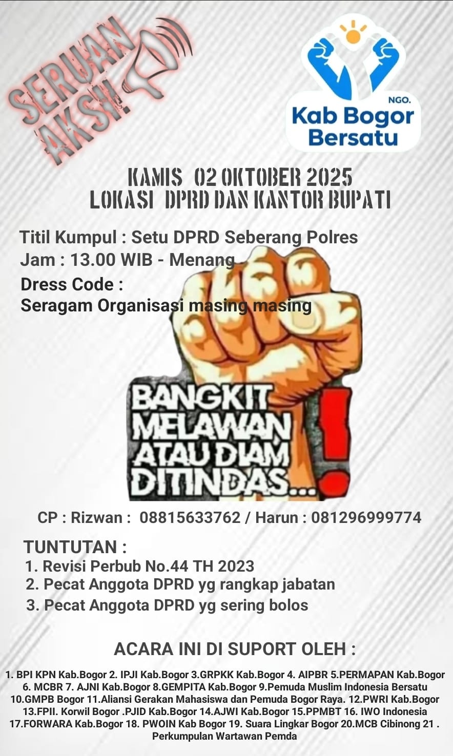 “Kami akan lakukan aksi tanggal 2 Oktober 2025. Aksi ini merupakan gabungan komponen masyarakat Kabupaten Bogor yang melibatkan LSM, Ormas, Wartawan, Mahasiswa, dan masyarakat umum. Kami bersatu menuntut perubahan dan transparansi pemerintahan,” tegasnya, Rabu (1/10/2025).