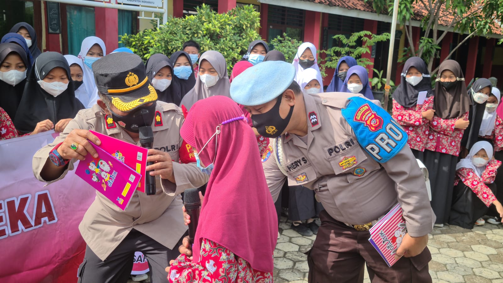 “Siapa yang hapal Pancasila ngacung…..! Ada hadiah buku tulis dari Kapolsek….!”, ujar Kapolsek kepada siswa/i.