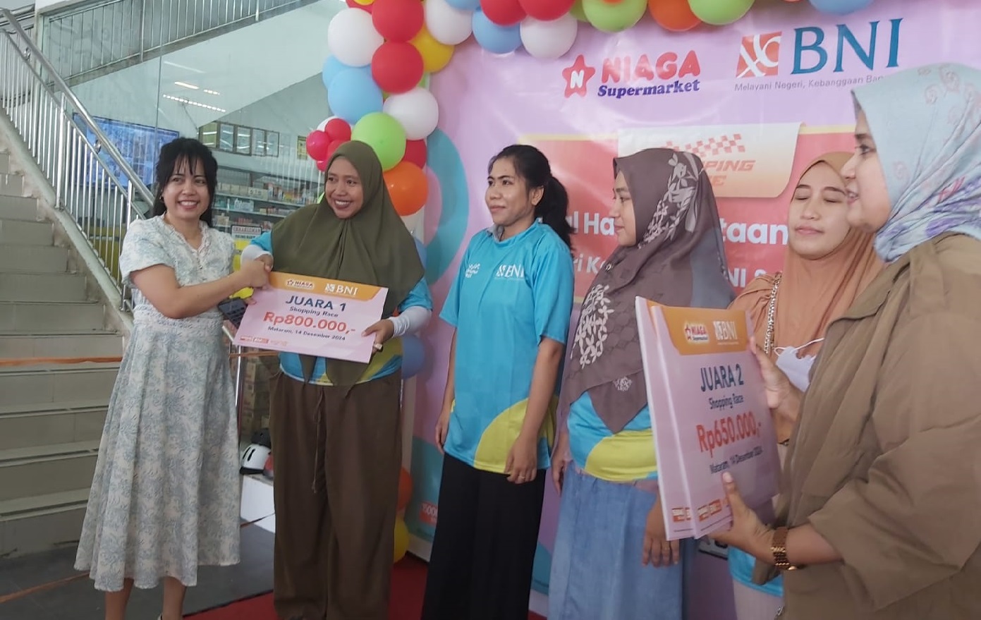 SKI|Mataram, – PT Bank Negara Indonesia (Persero) Tbk atau BNI terus berkomitmen untuk menjadi pilihan utama nasabah dalam bertransaksi. Dalam upaya memberikan apresiasi kepada nasabah setianya, BNI menyelenggarakan program Shopping Race di 17 kota besar di Indonesia. Program ini merupakan hasil kolaborasi BNI dengan berbagai merchant groceries, termasuk Niaga Supermarket di Kota Mataram.