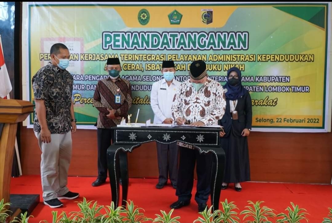 SKI l Lombok Timur-Bupati Lombok Timur,HM.Sukiman Azmy menghadiri kegiatan penandatanganan perjanjian kerjasama secara terintegrasi pelayanan administrasi kependudukan akta cerai, isbat nikah, dan buku nikah (Kinan Ceria) yang bertempat di aula Kantor Kementerian Agama Lotim,Selasa (22/2).