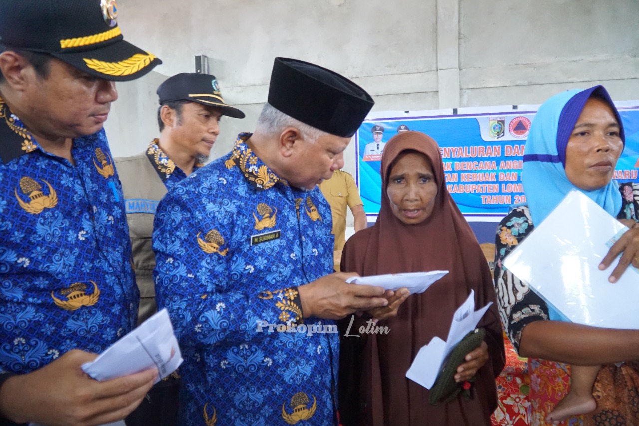 SKI l Lombok Timur-Bupati Lombok Timur,HM.Sukiman Azmy memberikan bantuan kepada warga di dua kecamatan yakni Keruak dan Jerowaru yang menjadi korban bencana angin puting beliung,Senin (17|10).