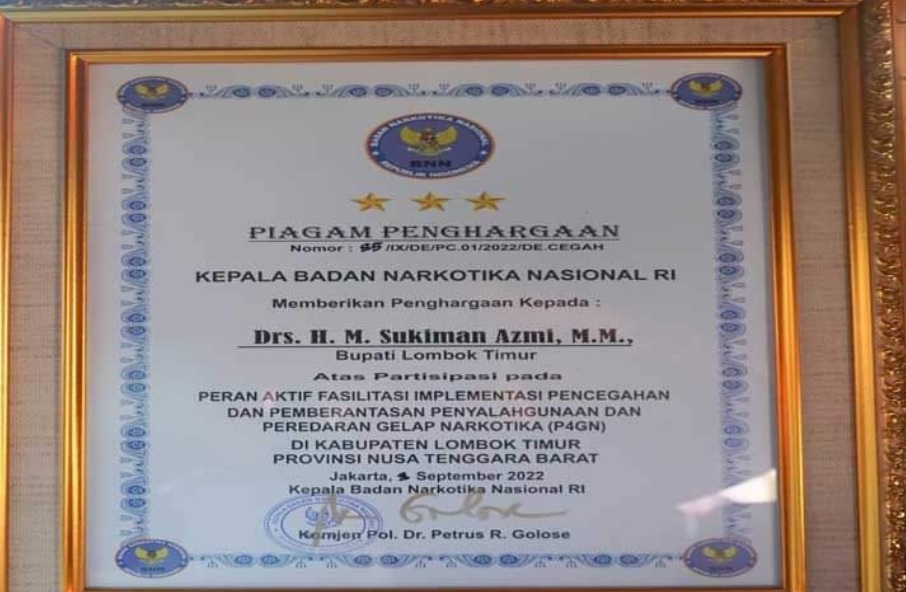 Penghargaan tersebut diberikan kepada Bupati Lotim atas peran aktif memfasilitasi Implementasi Pencegahan dan Pemberantasan Penyalahgunaan dan Peredaran Gelap Narkotika (P4GN) di Kabupaten Lotim.
