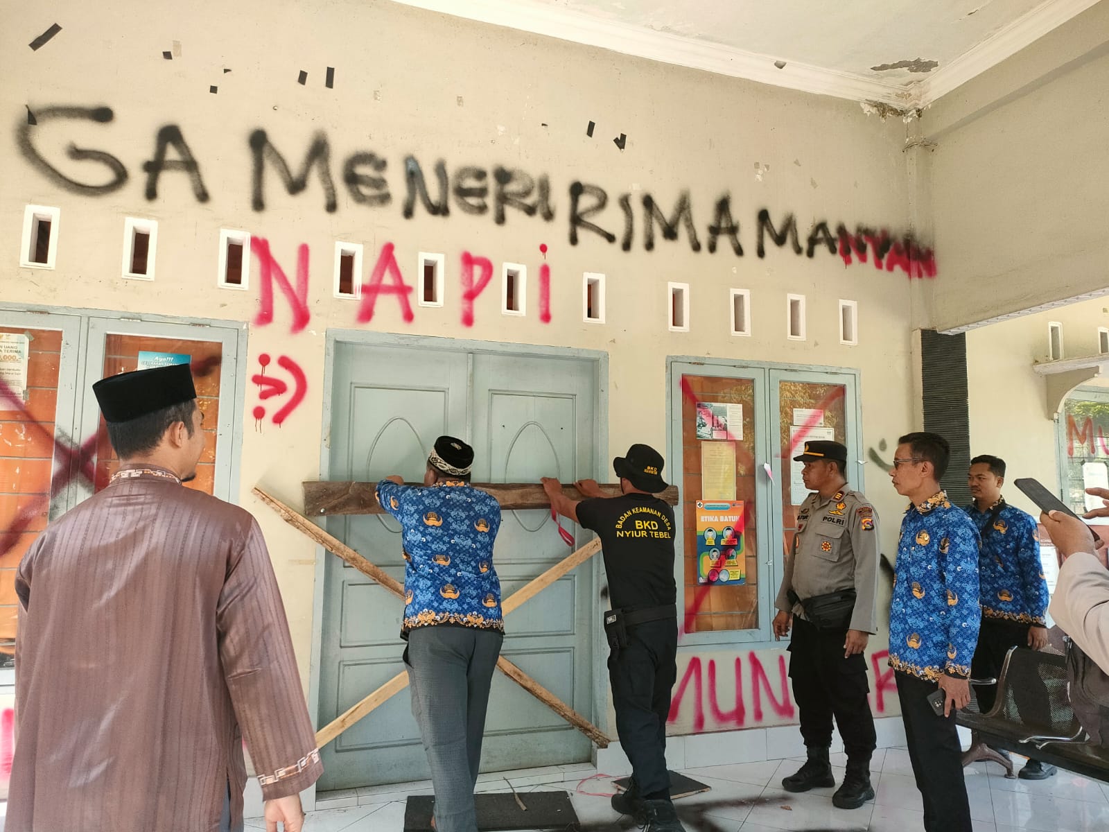 Selain itu warga juga menuliskan di halaman kantor dan tembok kantor desa yang bunyinya meminta Kades mundur, tidak mau dipimpin oleh seorang mantan narapidana.