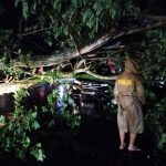 SKI| Lombok Tengah– Pohon tumbang dan menimpa sebuah kendaraan roda empat (R4) kembali terjadi di jalan raya depan SMPN 3 Kopang, Desa