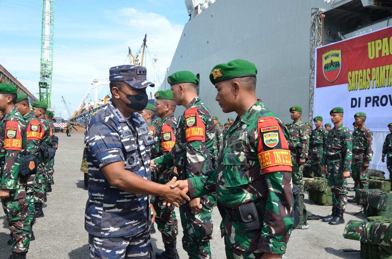 450 orang personil Satgas Pamtas RI-PNG Sektor Utara Yonif 132/Bima Sakti di Papua Tahun 2022 yang akan diberangkatkan dengan KRI Banda Aceh-539 yang dikomandani oleh Letkol Laut (P) Edi Herdiana. Kegiatan pengantaran dilaksanakan di Dermaga C Pelindo Regional I Cabang Dumai, Jalan Datuk Laksamana Kota Dumai, Senin (26/09/2022).