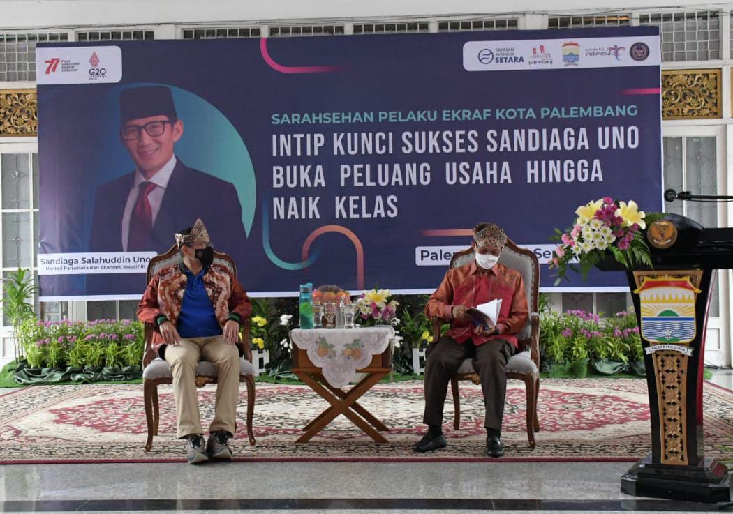 SKI, Palembang,- Bertempat di Rumah Dinas Walikota Palembang, Jalan Talang Semut, Kecamatan Bukit Kecil, Kota Palembang, Sumatera Selatan telah berlangsung acara Sarasehan Pelaku Eksraf Kota Palembang dengan tema “Intip Kunci Sukses Sandiaga Uno Buka Peluang Usaha Hingga Naik Kelas”, Rabu (14/09/2022).