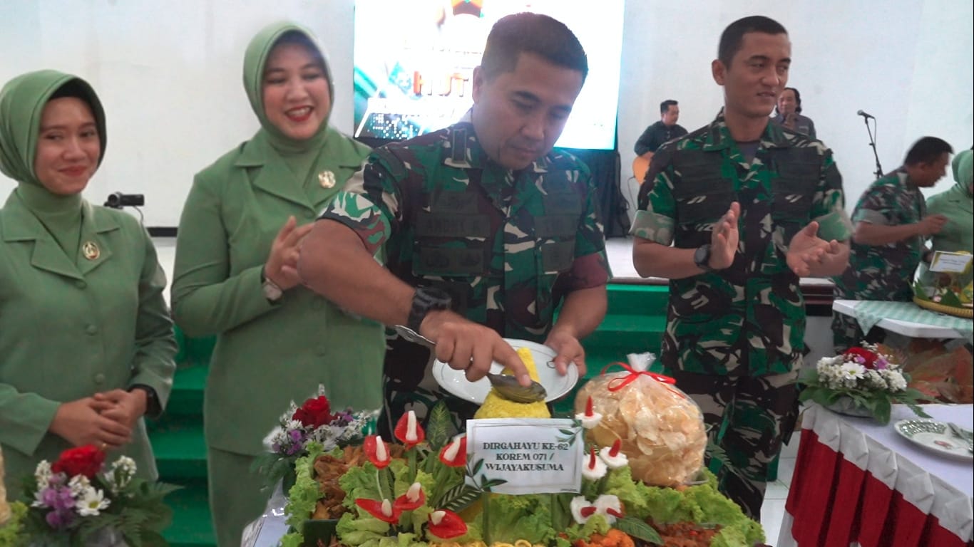 Tasyakuran HUT Ke-62 Korem 071/Wijayakusuma ditandai dengan pemotongan tumpeng oleh Danrem 071/Wijayakusuma Kolonel Czi Mohammad Andhy Kusuma, S.Sos., M.M., M.Han didampingi Ketua Persit Kartika Chandra Kirana Koorcab Rem 071 PD IV/Diponegoro Ny. Diah Mohammad Andhy Kusuma. Potongan tumpeng tersebut selanjutnya diberikan kepada Pelda Priyono sebagai perwakilan prajurit dan PNS tertua PNS Kholid.