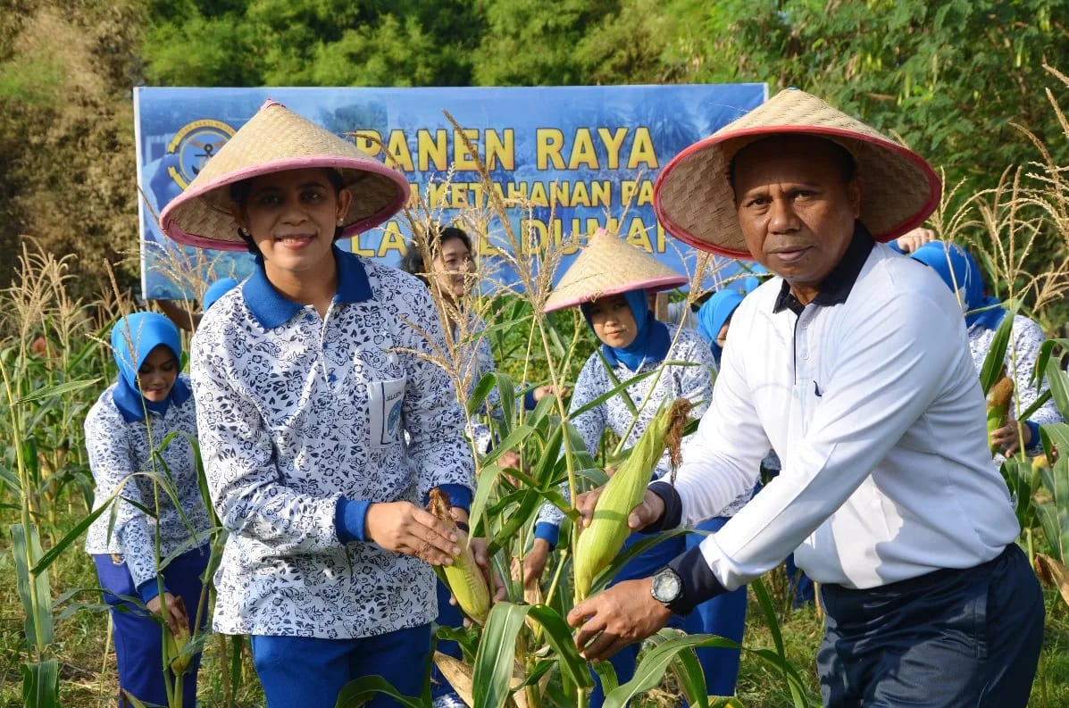 SKI | Dumai,- Dalam rangka mendukung program Ketahanan Pangan Lanal Dumai, Komandan Lanal Dumai Kolonel Laut (P) Stanley Lekahena, M.Tr.Hanla., didampingi Ketua Cabang 4 Korcab I DJA I Ny. Sandra Stanley bersama Pengurus Jalasenastri, Prajurit dan PNS Lanal Dumai melaksanakan Panen Raya Jagung. Kegiatan dilaksanakan di Kebun Lanal Dumai, Jalan Tanjung Jati, Kelurahan Buluh Kasap, Kecamatan Dumai Timur, Kota Dumai, Kamis (21/7/22).