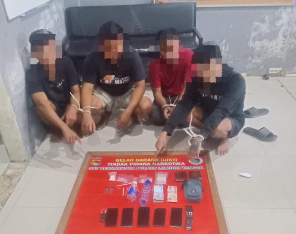 SKI| Lombok Tengah – Sebanyak empat orang terduga pelaku tindak pidana Narkotika di Dusun Bangket Tengak, Desa Puyung, Kecamatan Jonggat, Kabupaten Lombok Tengah pada Senin (5|6) diamankan Satres Narkoba Loteng.