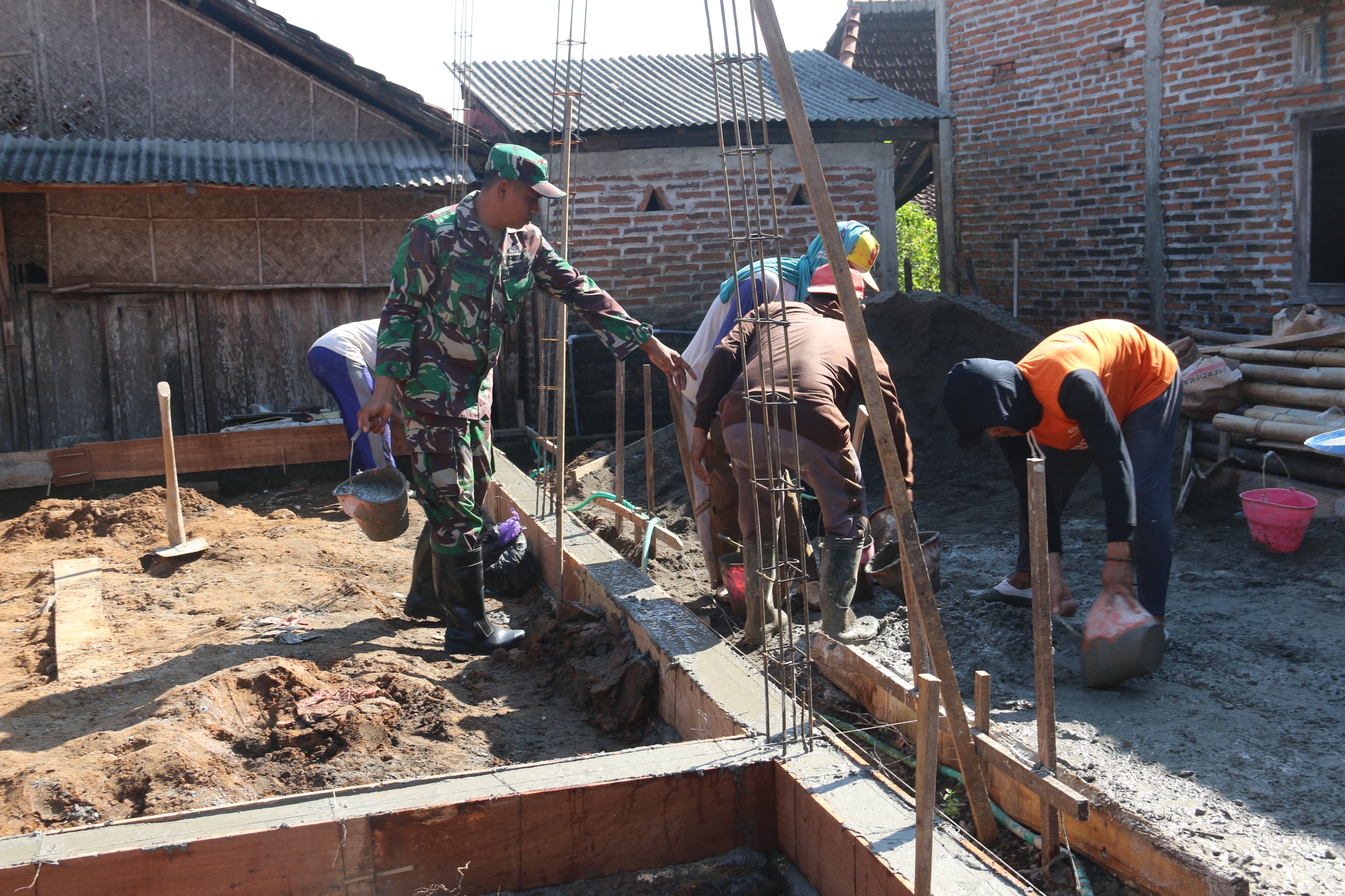 Anggota Satgas TMMD bersama warga setempat terlibat langsung dalam proses pengerjaan secara gotong royong. Kegiatan dimulai dari pembuatan pondasi, kemudian dilanjutkan dengan penyusunan rangka bangunan hingga tahap konstruksi berikutnya.