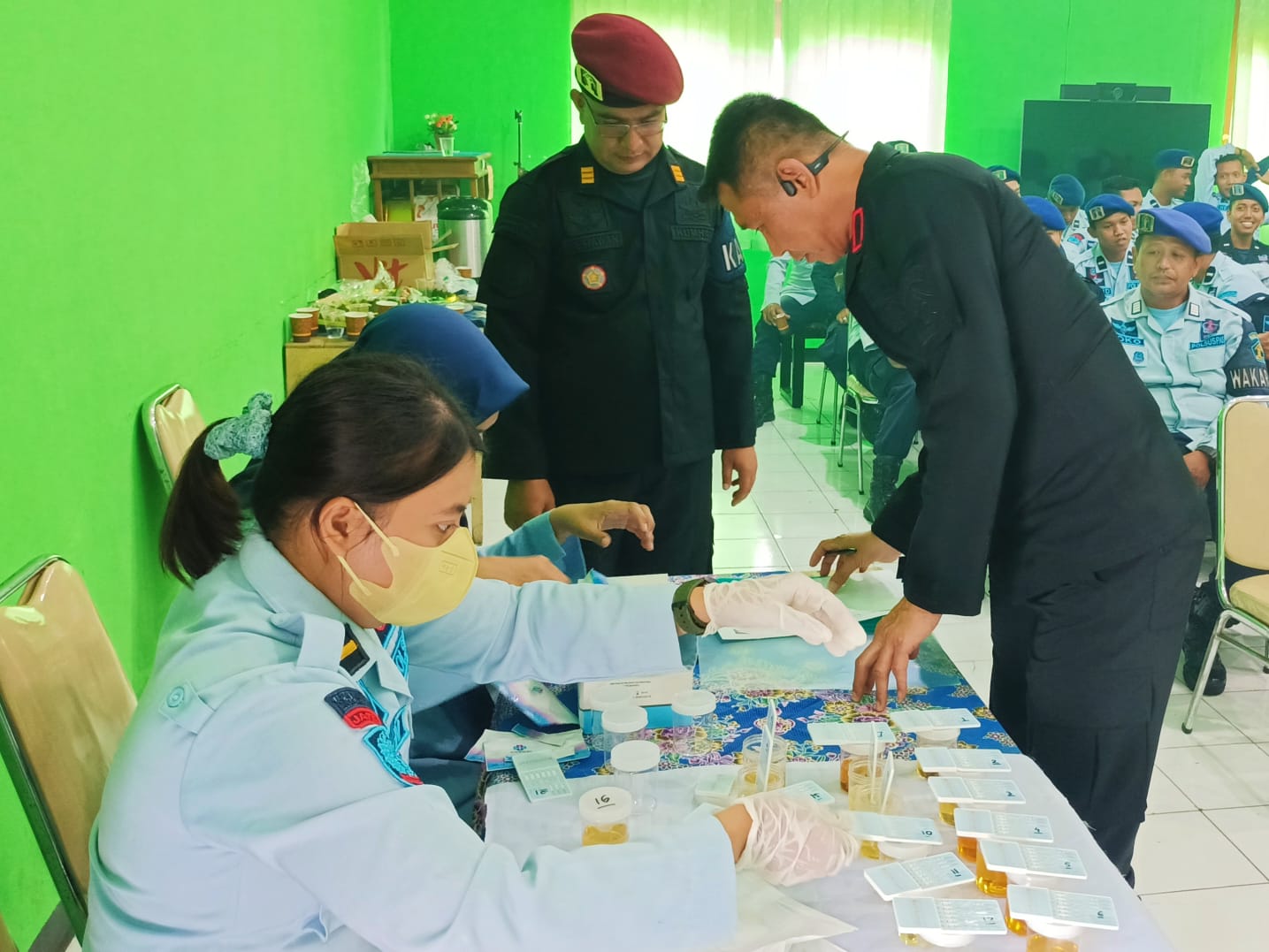 Kegiatan dilanjutkan dengan pengambilan sampel urin bagi petugas pengamanan, dan dari hasil pemeriksaan yang dilakukan semuanya dinyatakan “Negatif”. (Ijal).