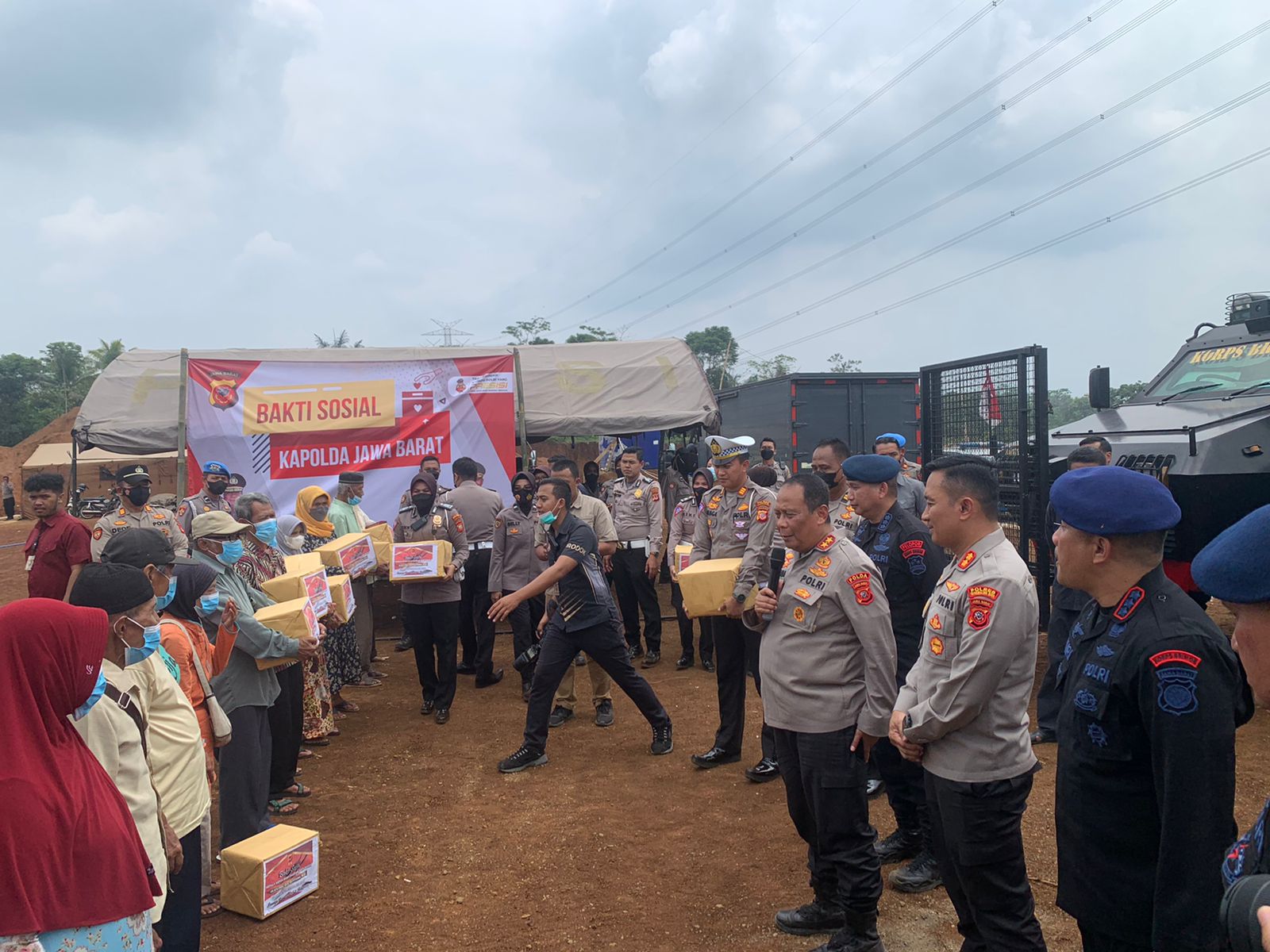 Selesai meninjau pembangunan Mako, kegiatan dilanjutkan dengan pemberian bantuan sembako dari Kapolda Jabar kepada warga sekitar Desa Ancol.