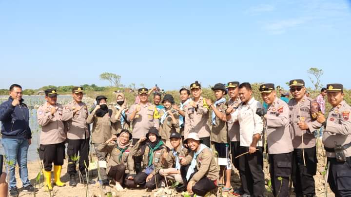 Jepara – Kapolres Jepara AKBP Wahyu Nugroho Setyawan menghadiri puncak penanaman 1.000 pohon mangrove bersama warga masyarakat di kawasan Pantai Kropak, Desa Bondo, Kecamatan Bangsri, Kabupaten Jepara, Jumat (21/7/2023).