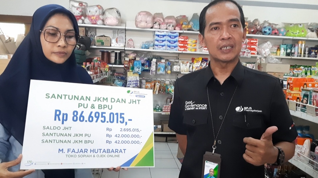 “Hari ini kami dari BPJS Cabang Bogor Cileungsi menyerahkan santunan kepada ahli waris (Alm) M. Fajar Hutabarat yaitu Ibu Widya sebagai penerima manfaat jaminan sosial ketenagakerjaan sebesar Rp86.695.015,-. Almarhum menerima manfaat dari dua segmen kepesertaan yang terdaftar yaitu: 2 manfaat BPJS Bukan Penerima Upah (PU) sebagai Ojek Online (Ojol) dan 3 manfaat BPJS Penerima Upah (PU) sebagai pedagang dengan membantu istri jualan di Toko milik keluarga,” ujar Dedy.