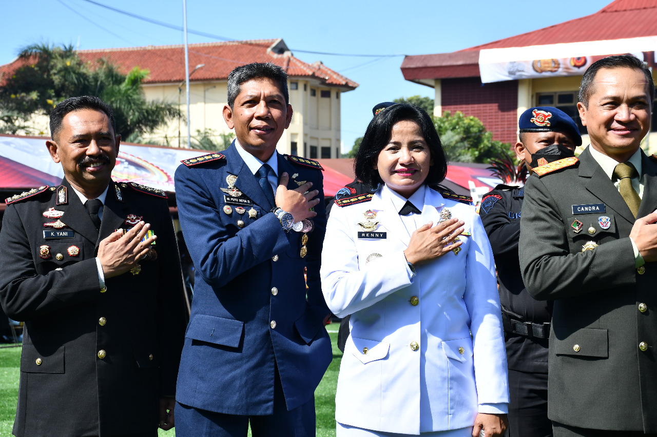 SKI | Bandung – Komandan Lanal Bandung Kolonel Laut (KH/W) Dr. Renny Setiowati, S.T., M.Sc., M.Tr.Hanla., beserta 1 SST Pasukan bersenjata Lanal Bandung yang dipimpin Danton Letda Laut (S) Yadi Suryadi, S.A.P., (Pa Ur Yar BP Lanal Bandung) mengikuti kegiatan Acara Puncak Upacara dan Syukuran Hari Bhayangkara Ke-76 Tahun 2022 dengan tema “Polri Yang Presisi Mendukung Pemulihan Ekonomi dan Reformasi Struktural Untuk Mewujudkan Indonesia Tangguh-Indonesia Tumbuh”, bertempat di Lapangan Futsal Mapolda Jabar, Jalan Soekarno Hatta No.748 Kota Bandung, Selasa (05/07/2022).