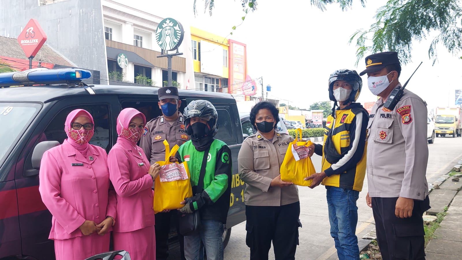 Melalui Polri Peduli, Polsek Pamulang bersama Bhayangkari bagikan sembako kepada masyarakat terdampak kenaikan BBM. Bansos sembako kepada para pengemudi angkutan umum dan Ojek online di Jl. Raya Siliwangi Kel. Pamulang Barat, sabtu (10/09/22).