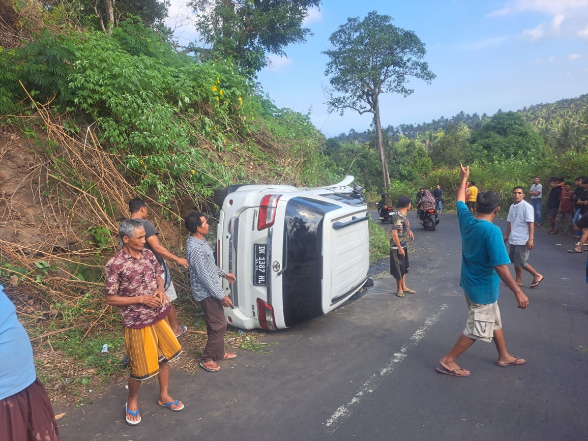 SKI | Lotim – Sebuah mobil fortunerwarna putih dengan Nopol DK 1387 HL yang dikemudikan Khaerul Iman (43) Warga Praya Lombok Timur mengalami kecelakaan tunggal dengan terguling di jalur Sembalun-Suele Lombok Tengah ,Minggu sore (6|7) sekitar pukul 15.00 wita.