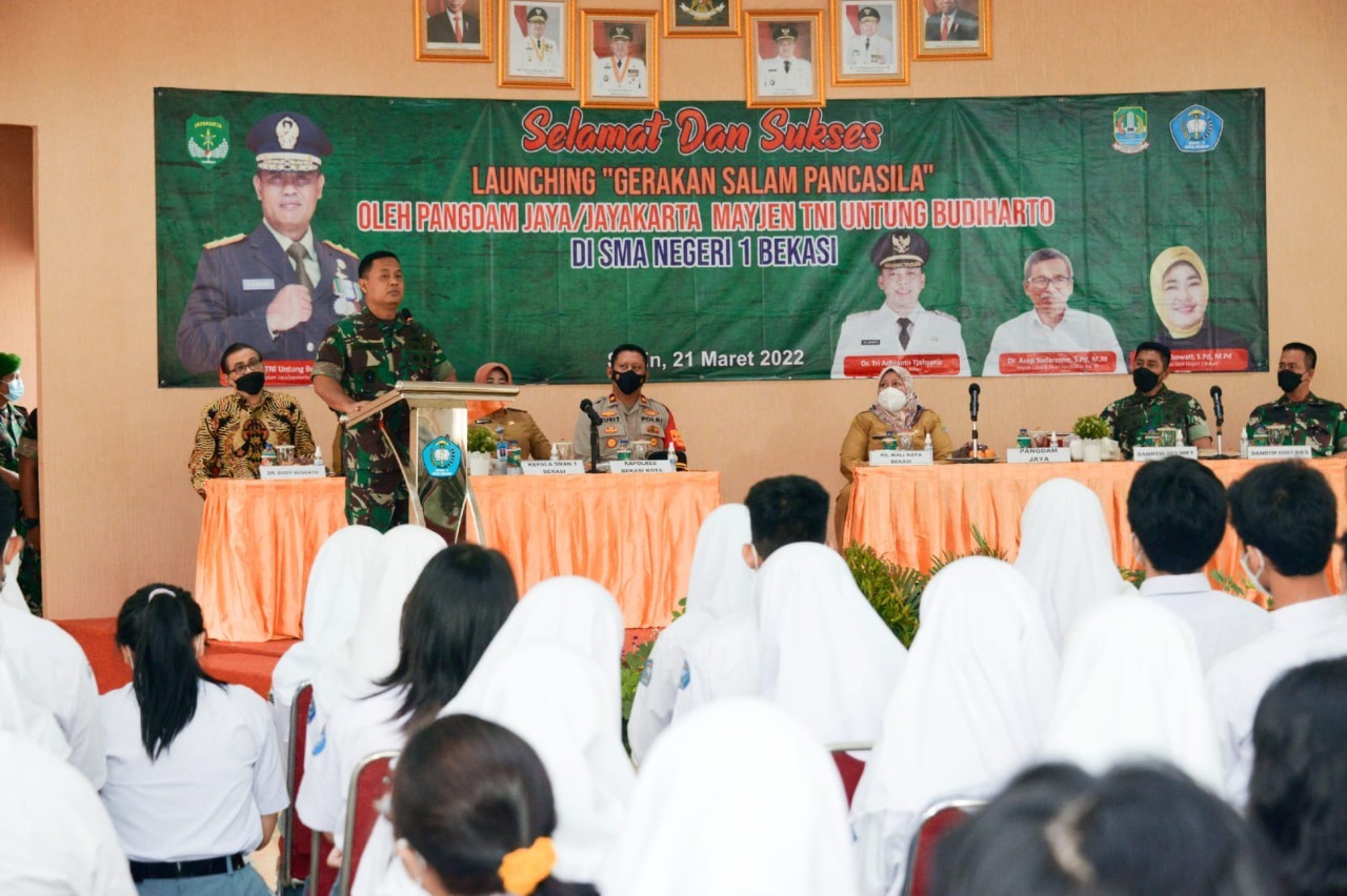 SKI | Bekasi – Pangdam Jaya/Jayakarta Mayjen TNI Untung Budiharto launching Salam Pancasila de ngan kegiatan Army Goes To School di SMA Negeri 1 Bekasi, Jl. Agus Salim No. 181 Kota Bekasi, Senin (21/3/22).