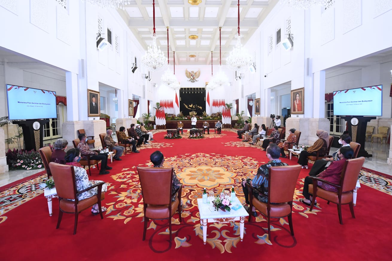 SKI|Jakarta-Presiden Joko Widodo menerima kunjungan para seniman dan budayawan di Istana Negara, Jakarta, pada Kamis, 10 Februari 2022. Pada kesempatan tersebut, para seniman menyampaikan harapannya kepada Presiden mengenai pelaksanaan kegiatan pertunjukan seni budaya di Tanah Air selama masa pandemi.