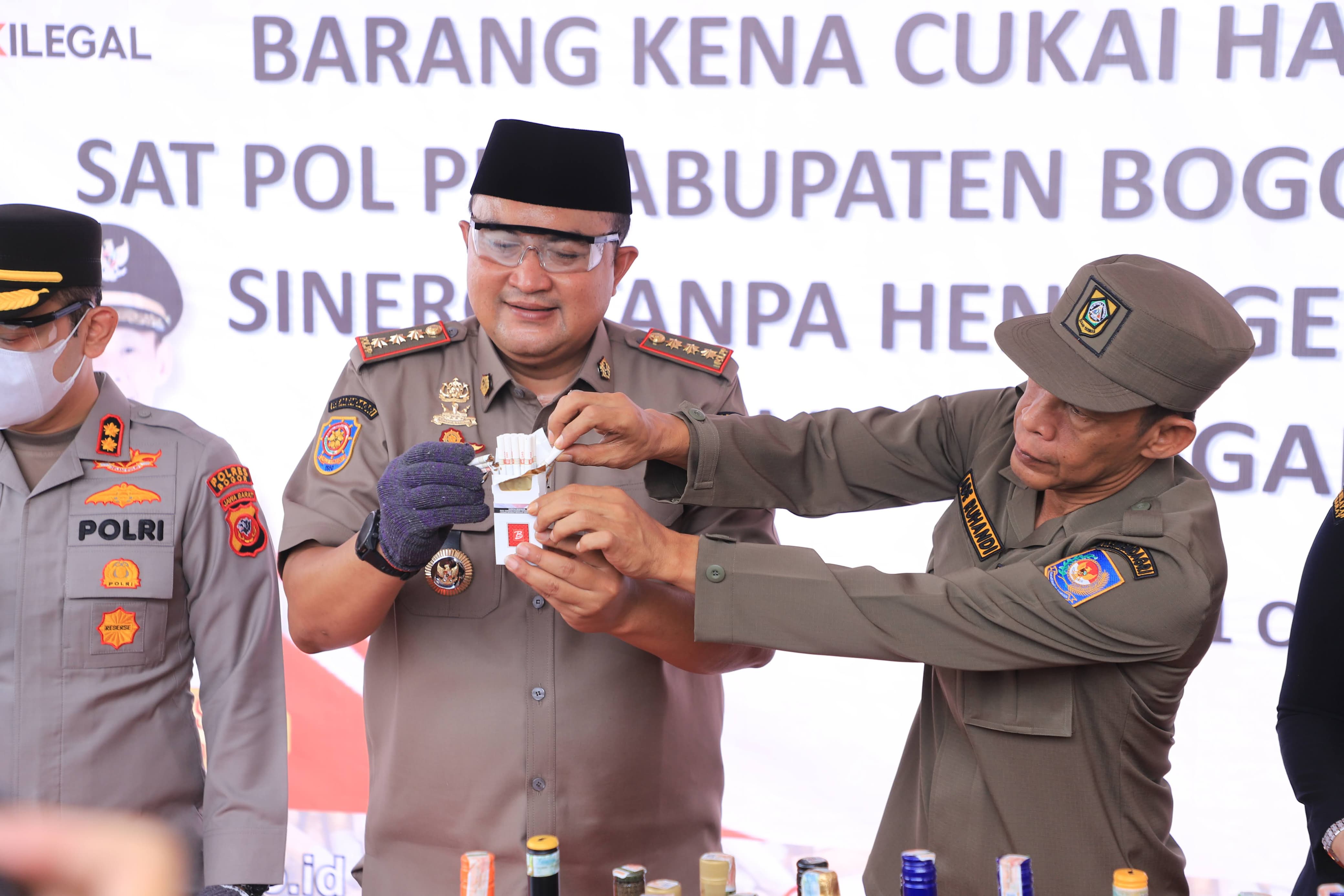 SKI CIBINONG-Bupati Bogor, Rudy Susmanto bersama Kepala Kantor Wilayah Ditjen Bea Cukai Jawa Barat, Finari Manan dan jajaran Forkopimda Kabupaten Bogor memusnahkan lebih dari 1,8 juta batang rokok ilegal dan sejumlah minuman keras (miras) hasil penindakan. Total nilai barang yang dihancurkan diperkirakan mencapai Rp2,8 miliar, dengan potensi kerugian negara yang berhasil diselamatkan sekitar Rp1,4 miliar. Kegiatan dilaksanakan di area Stadion Pakansari, Cibinong, Selasa (21/10).Bupati Bogor, Rudy Susmanto menyampaikan terima kasih atas kolaborasi yang kuat antara Forum Koordinasi Pimpinan Daerah (Forkopimda), Kantor Wilayah Ditjen Bea Cukai Jawa Barat, Satuan Polisi Pamong Praja, Linmas, Organisasi Kemasyarakatan, dan partisipasi aktif masyarakat. Menurutnya, keberhasilan operasi ini bertujuan utama melindungi masyarakat dan generasi muda Bogor. Upaya pemerintah belum mencapai titik sempurna.“Memang langkah-langkah yang kami ambil belum sempurna, belum tuntas semuanya. Kalau kita ingin tuntas, kita ingin selesai, kuncinya satu, bukan hanya pemerintah, tetapi butuh dukungan dan peran serta aktif dari seluruh masyarakat,” tandas Rudy Susmanto.Rudy menjelaskan bahwa barang bukti yang dimusnahkan hari ini merupakan hasil dari operasi yang berkelanjutan, bukan hanya satu kejadian. Penindakan tersebut menyasar dua komoditas utama, toko-toko yang menjual minuman beralkohol tanpa izin dan toko-toko yang menjual rokok tanpa cukai.”Pemusnahan barang bukti ini bukan dari satu kejadian operasi, tapi dari beberapa kali pemeriksaan dan penindakan. Di Kabupaten Bogor, untuk minuman beralkohol, kami tidak mengeluarkan izin secara bebas. Dan terkait rokok tanpa cukai, tentu kita punya semangat yang sama untuk memberantasnya,” jelas Rudy.Bupati Rudy mengungkapkan, semangat penindakan ini sejalan dengan arahan Presiden Prabowo, semangat Menteri Keuangan, adalah melakukan langkah-langkah yang sama, dan kita berjuang bersama-sama, menempatkan perlindungan masyarakat sebagai prioritas utama.”Yang terpenting adalah, kita juga melindungi generasi-generasi muda kita, masyarakat Kabupaten Bogor, membangun bangsa dari wilayah masing-masing, dari Bogor untuk Indonesia,” ungkap Rudy Susmanto.Kepala Kantor Wilayah Ditjen Bea Cukai Jawa Barat, Finari Manan membeberkan, hari ini, kita menyaksikan pemusnahan sebanyak 1.887.812 batang rokok ilegal, sejumlah minuman mengandung etil alkohol (MMEA) ilegal, dan juga tembakau iris. Ini adalah wujud nyata sinergi dan kolaborasi bersama.“Total barang yang dimusnahkan pada hari ini diperkirakan bernilai kurang lebih Rp2,8 miliar, dengan potensi kerugian negara yang berhasil diselamatkan mencapai sekitar Rp1,4 miliar,” beber Finari..Menurutnya, penindakan Khusus untuk Kabupaten Bogor, penindakan rokok ilegal yang telah kami lakukan sepanjang tahun 2025 sudah mencapai sekitar 10 juta batang rokok. Secara keseluruhan di Jawa Barat, Bea Cukai menargetkan penindakan sebesar 78,5 juta batang rokok ilegal.”Sampai dengan hari ini, realisasi penindakan kita sudah mencapai 78 juta batang. Perkiraan kita, sampai Desember 2025 nanti, total penindakan bisa mencapai kurang lebih 90 juta batang,” ujar Finari.Ia menuturkan, rokok-rokok ini umumnya rokok lokal yang kami cegah saat melintas dari Madura, Jawa Tengah, dan Jawa Timur. Jadi, perlu kami tegaskan bahwa Kabupaten Bogor atau Jawa Barat bukan tempat produksi, tetapi merupakan tempat perlintasan dan pemasaran.“Peredaran rokok ilegal marak karena harganya yang murah, yang memicu konsumen beralih dari rokok legal. Pemasaran rokok ilegal ini ditemukan di toko-toko dan warung-warung, dengan daerah rawan meliputi Cirebon, Purwakarta, Bogor, dan Bandung,” tuturnya.Finari menghimbau masyarakat untuk tidak terlibat dalam peredaran rokok ilegal. Sesuai Pasal 54 Undang-Undang Cukai, setiap pihak yang mengedarkan, menimbun, membeli, bahkan mengkonsumsi rokok ilegal, dapat dikenakan sanksi pidana berupa hukuman penjara paling lama 1 tahun sampai 5 tahun atau denda Rp200 juta sampai Rp5 miliar.(TIM KOMUNIKASI PUBLIK / DISKOMINFO KABUPATEN BOGOR)