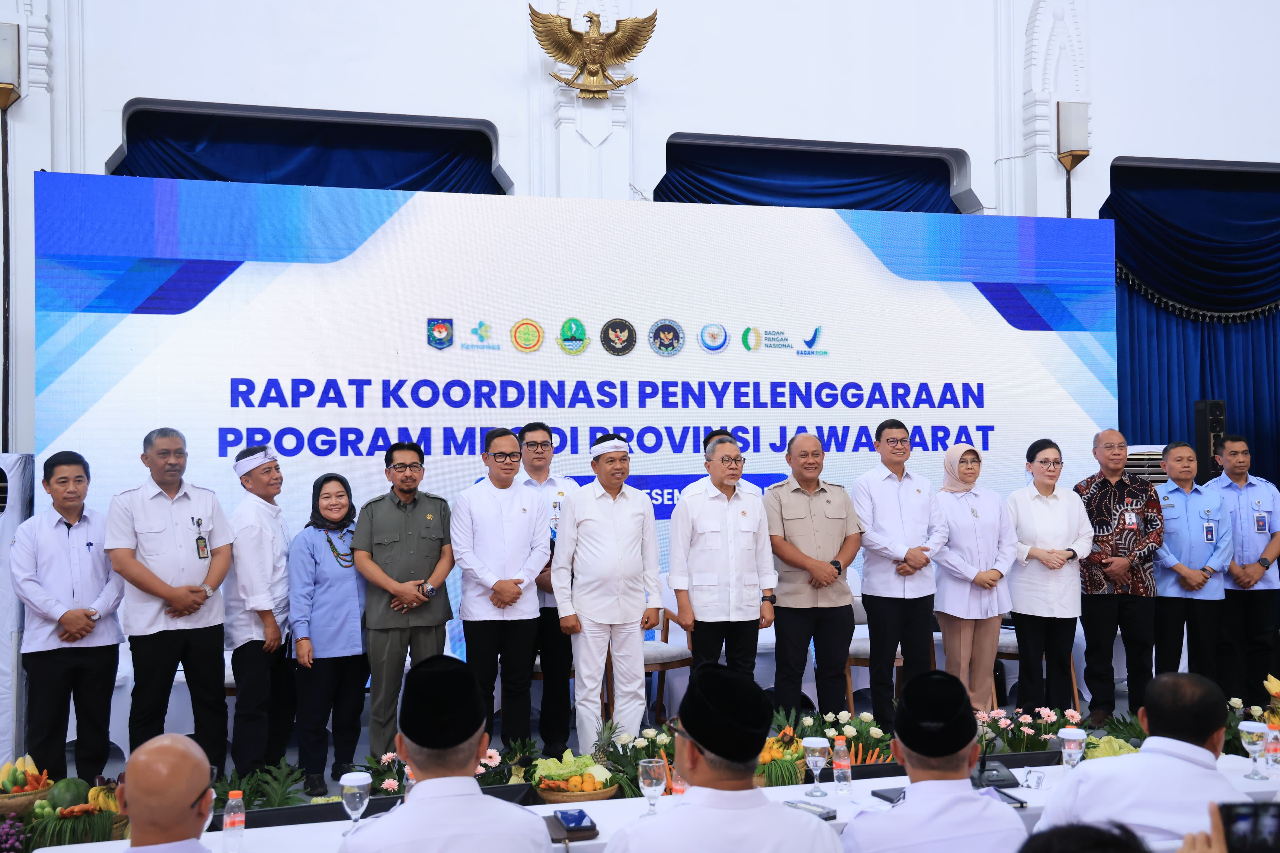 SKI Bandung – Sekretaris Daerah (Sekda) Kabupaten Bogor, Ajat Rochmat Jatnika menghadiri Sosialisasi Peraturan Presiden Nomor 115 Tahun 2025 tentang Tata Kelola Penyelenggaraan Program Makan Bergizi Gratis, serta percepatan sertifikasi Sertifikat Laik Higiene Sanitasi (SLHS) pada SPPG di Jawa Barat, di Bandung, Rabu (17/12).Kehadiran Seka Ajat dalam rangka mendukung sinergi lintas pemerintahan demi suksesnya Program Strategis Nasional Makan Bergizi Gratis (MBG) di Jawa Barat yang merupakan bagian dari visi Asta Cita Presiden untuk Indonesia Emas 2045. Hadir Menteri Koordinator Bidang Pangan (Menko Pangan) Zulkifli Hasan dan Gubernur Jawa Barat, Dedi Mulyadi.Hadir Menteri Koordinator Bidang Pangan (Menko Pangan) Zulkifli Hasan menegaskan bahwa program Makan Bergizi Gratis (MBG) merupakan program pemerintah yang menjadi tanggung jawab bersama seluruh unsur pemerintahan, mulai dari pemerintah pusat hingga pemerintah daerah dan desa.“Ini bukan pekerjaan satu lembaga, tetapi pekerjaan kita semua. Keputusan Presiden Nomor 115 telah menegaskan bahwa MBG adalah tanggung jawab bersama, dengan BGN sebagai penanggung jawab utama,” tegas Zulkifli Hasan.Zulkifli melanjutkan, meskipun Badan Gizi Nasional (BGN) menjadi pelaku utama dalam pelaksanaan MBG, keberhasilan program ini tidak dapat dilepaskan dari peran aktif gubernur, bupati, camat, kepala desa, kepala dinas, serta seluruh pemangku kepentingan lainnya.“Apabila program MBG dijalankan secara kolaboratif, maka akan mampu melahirkan gerakan ekonomi rakyat. Masyarakat didorong untuk terlibat langsung dalam penyediaan bahan pangan, seperti menanam sayuran dan buah-buahan, membudidayakan ikan, serta beternak ayam,” kata Zulkifli.Gubernur Jawa Barat, Dedi Mulyadi menegaskan pentingnya membangun kerja sama yang erat dalam pelaksanaan program MBG sebagai program bersama lintas tingkatan pemerintahan, mulai dari pemerintah pusat, pemerintah provinsi, pemerintah kabupaten/kota, hingga pemerintah desa.“Program MBG harus mampu memberikan manfaat yang sebesar-besarnya bagi masyarakat, tidak hanya dari sisi peningkatan kualitas kesehatan, tetapi juga sebagai penggerak pertumbuhan ekonomi, peningkatan daya saing daerah, serta upaya mewujudkan rasa keadilan sosial,” tandas Dedi Mulyadi.(TIM KOMUNIKASI PUBLIK / DISKOMINFO KABUPATEN BOGOR)