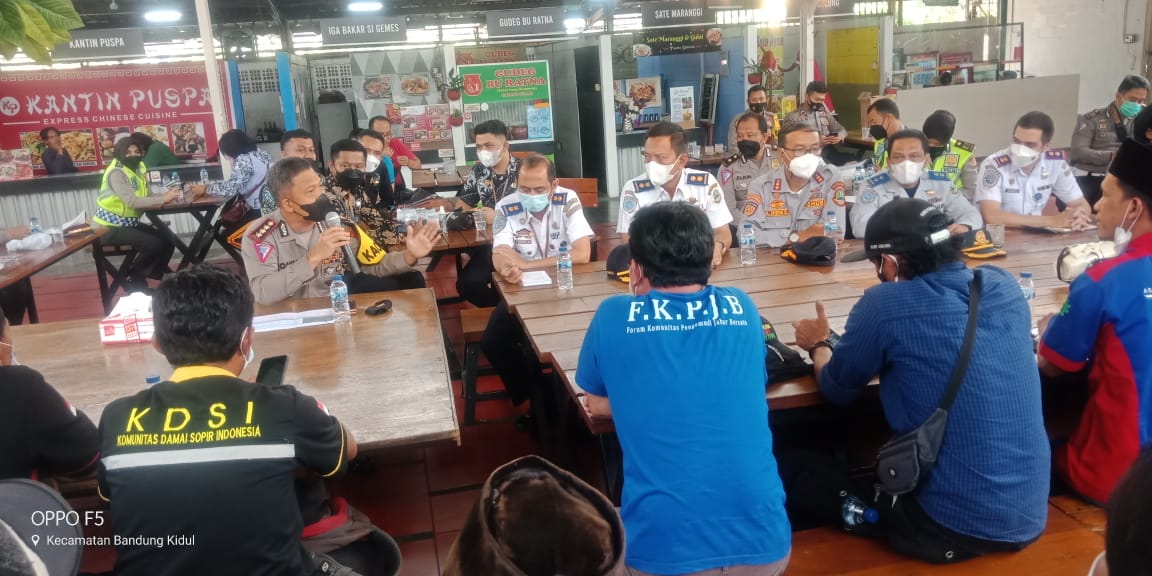 SKI | POLDA JABAR – Pengemudi angkutan barang melaksankan audiensi (mediasi) dengan Dit Lantas Polda Jabar , Kementrian Perhubungan (BPTD IX Jabar) dan Dishub Provinsi Jabar bertempat di Area Food Court Batununggal, Jum’at (11/03/2022).