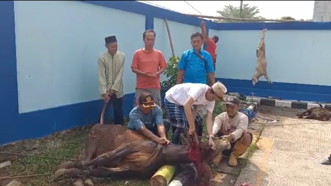 Penyembelihan hewan kurban dilakukan oleh Ustadz AY Sogir yang juga anggota DPRD Kabupaten Bogor terpilih.