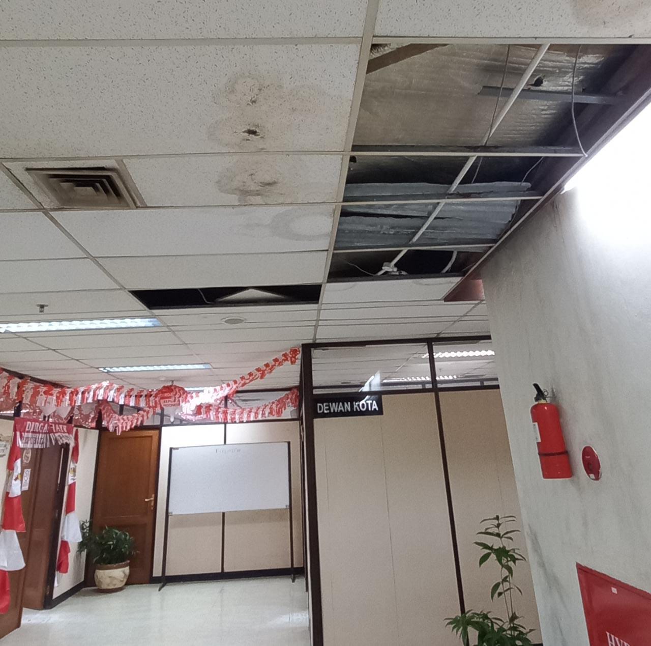 Salah satu kerusakan plafon yang mencolok terlihat di lantai 6 Gedung Blok A Kantor Wali Kota Jakpus, dekat lantor Dewan Kota dan Bagian Perekonomian.