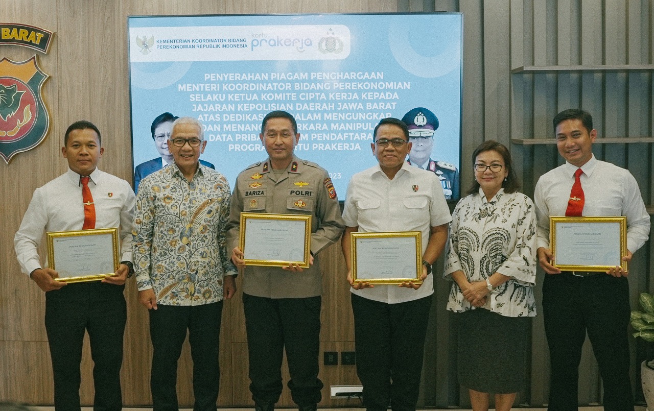 SKI | Jabar – Menteri Koordinator Bidang Perekonomian selaku Ketua Komite Cipta Kerja memberikan piagam penghargaan kepada jajaran Kepolisian Daerah Jawa Barat atas dedikasinya dalam mengungkap dan menangani perkara manipulasi data pribadi dalam pendaftaran Program Kartu Prakerja.