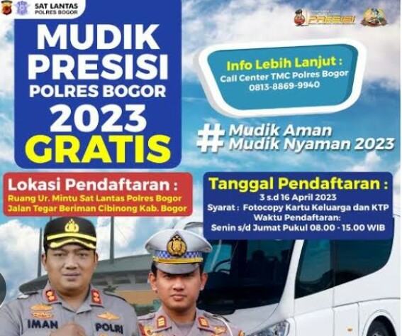 SKI Bogor, – Polres Bogor menyiapkan bus mudik gratis bagi masyarakat di wilayah Kabupaten Bogor yang ingin merayakan Hari Raya Idul Fitri 1444 H/2023 M di kampung halamannya. Pendaftaran mudik gratis dibuka mulai Senin 3 April 2023 di Urmin Satuan Lalu Lintas Polres Bogor.