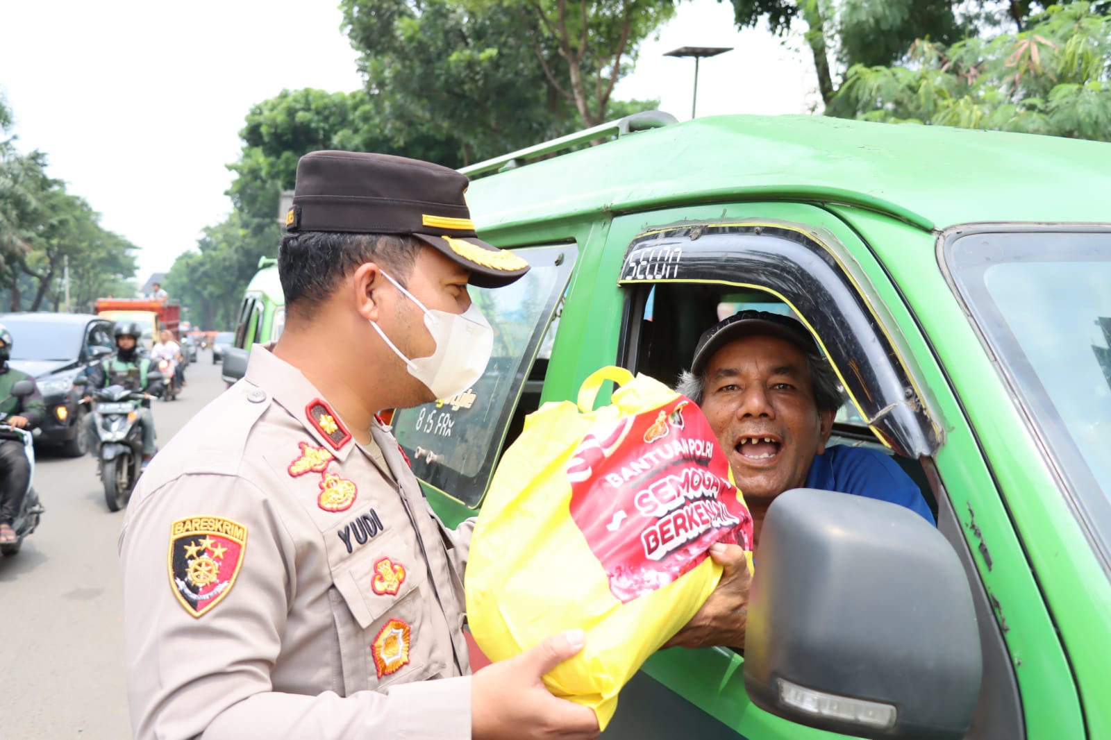 “Bantuan sembako tersebut diberikan kepada Sopir Angkot, Ojek Online, Pemulung, pedagang Kaki lima serta masyarakat yang lewat di lokasi giat pembagian Bansos Polres Tangerang Selatan. Bantuan sembako merupakan sumbangan dari Bapak Kapolres Tangerang Selatan yang sangat peduli terhadap masyarakat”.