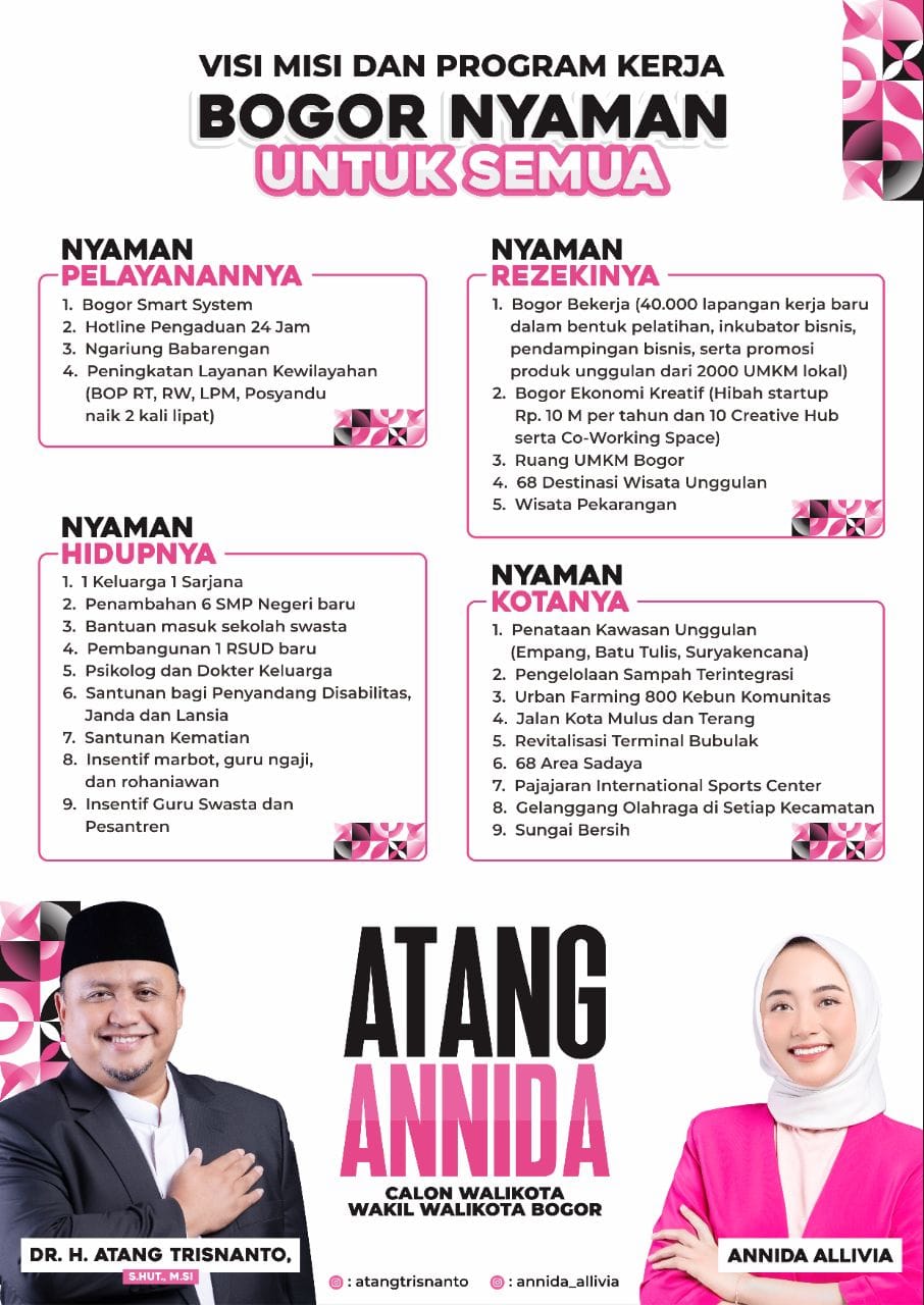 Warga kota Bogor yang belum menentukan pilihannya, agar tidak salah memilih dan mencoblos calon walikota Bogor, Atang-Annida Nomor urut 2 adalah pilihan yang tepat. Visi misinya jelas untuk memberikan kenyamanan bagi semua warga kota Bogor tanpa terkecuali.
