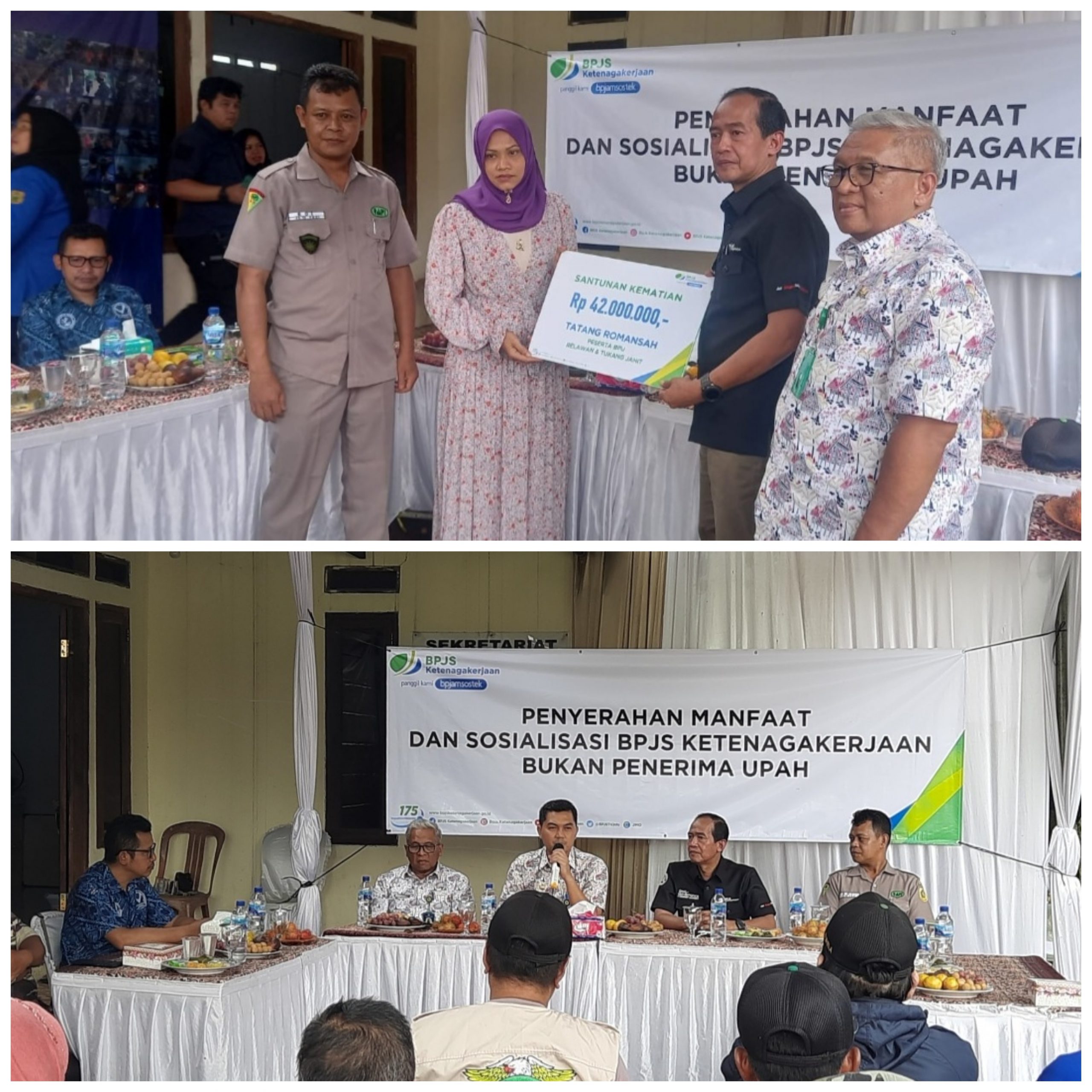 “BPJS Ketenagakerjaan Cabang Bogor Cileungsi menyerahkan santunan kepada ahli waris (Alm) Tatang Romansah yang berprofesi sebagai Relawan Team Reaksi Cepat (TRC) RAPI Wilayah Cileungsi serta berprofesi sebagai penjahit, pada hari ini secara simbolis menerima manfaat JKM BPJS Ketenagakerjaan sebesar Rp42.000.000 dan Almarhum baru bergabung menjadi peserta BPJS Bukan Penerima Upah ( BPU ) 5 bulan lalu,” ujar Dedy.