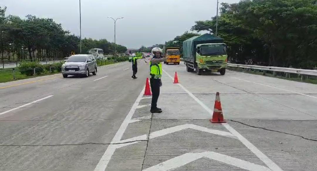 SKI | Majalengka – Selama Nataru Sejumlah personel Satlantas Polres Majalengka tampak mengalihkan arus kendaraan sumbu tiga ke atas dari jalur tol wilayah Kabupaten Majalengka. Pengalihan arus kendaraan besar tersebut dilaksanakan di Gerbang Tol Kertajati