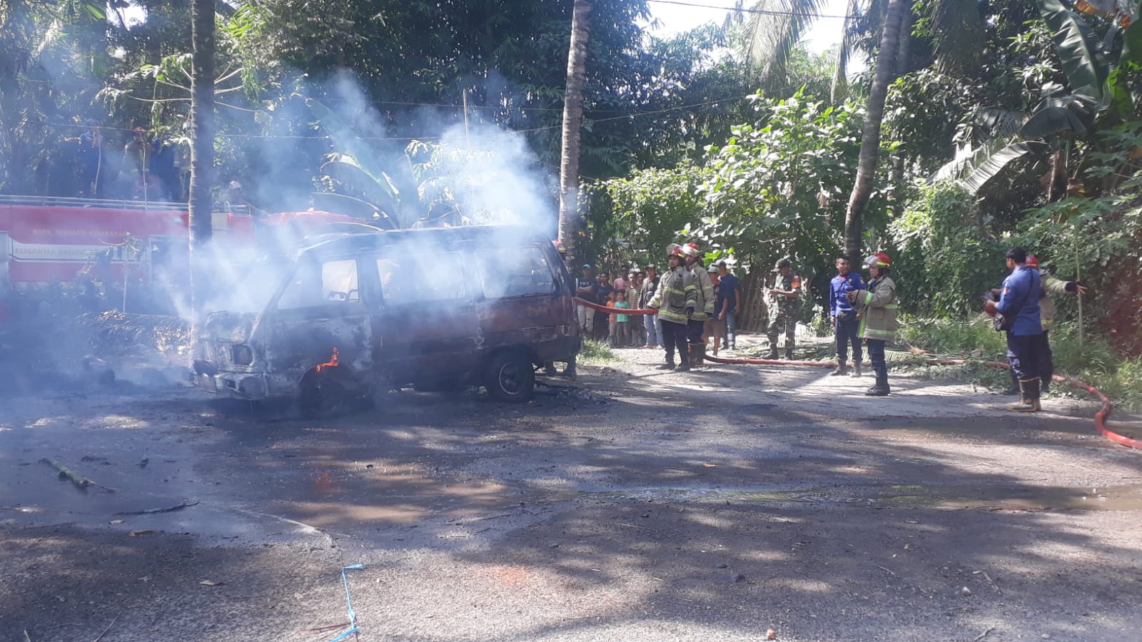 Sementara tidak lama datang petugas pemadam kebakaran untuk melakukan pemadaman terhadap mobil dan berugak yang terbakar agar tidak merembet ke tempat lain.
