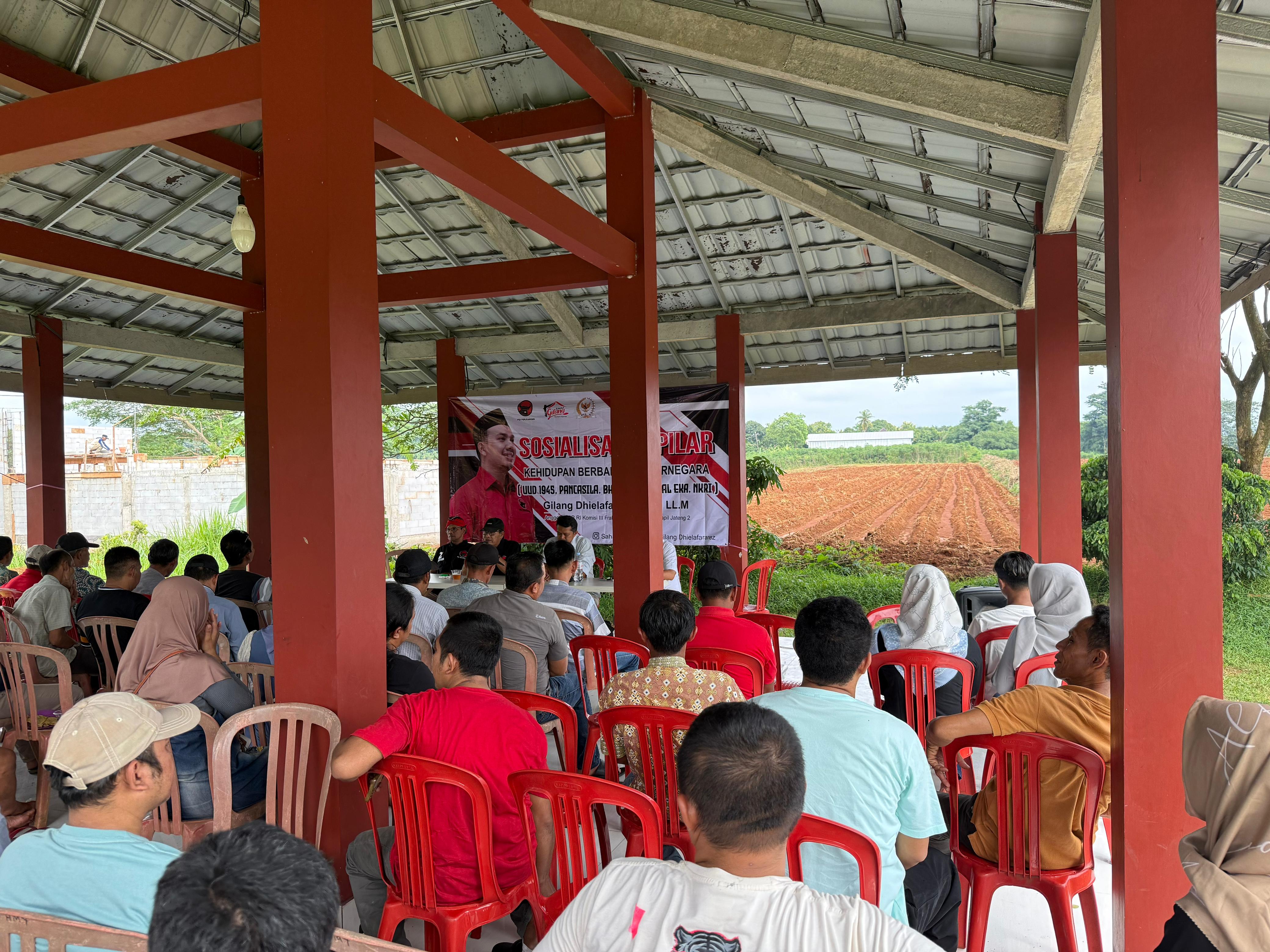 Mas Gilang menyampaikan puji syukur kepada Allah S. W. T dan terima kasih kepada Sahabat Gilang dan tokoh masyarakat yang telah berpartisipasi dan hadir dalam acara sosialisasi empat pilar, empat pilar adalah konsep yang merupakan bagian konsep untuk memperkuat kesadaran dan pemahaman tentang nilai nilai-nilai dan prinsip dasar kehidupan sehari-hari berbangsa dan bernegara Pancasila sebagai lima dasar Ketuhanan Yang Maha Esa, Kemanusiaan Yang Adil dan Beradab, Persatuan Indonesia yang merupakan hidup jangan mudah dibecah belah atau diadu domba, Kerakyatan yang dipimpin oleh Hikmat Kebijaksanaan dalam Permusyawaratan Perwakilan dan Keadilan Sosial bagi Seluruh Rakyat Indonesia ini penting bahwa masyarakat punya hak yang sama dihadapan Tuhan dalam Undang-undang Dasar 1945 konstitusi negara berisi tentang negara, pemerintahan dan hak-hak warga negara sebagai landasan hukum penyelenggara negara didalam wadah negara Kesatuan Republik Indonesia yang berdaulat, bersatu dan berkeadilan ini sudah jelas sekali dalam kehidupan sehari-hari yang Berbhinneka Tunggal Ika yang artinya Berbeda beda tetapi tetap satu menggambarkan keberagaman budaya, agama dan suku dengan semangat gotong royong serta persatuan dan kesatuan ini pentingnya sosialisasi empat pilar ini tegasnya ” Mas Gilang.