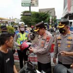 SKI | Bekasi – Kapolres Metro Bekasi Kota Kombes Pol Hengki bersama Satlantas Polres Metro Bekasi Kota bagikan helm pada saat pelaksanaan