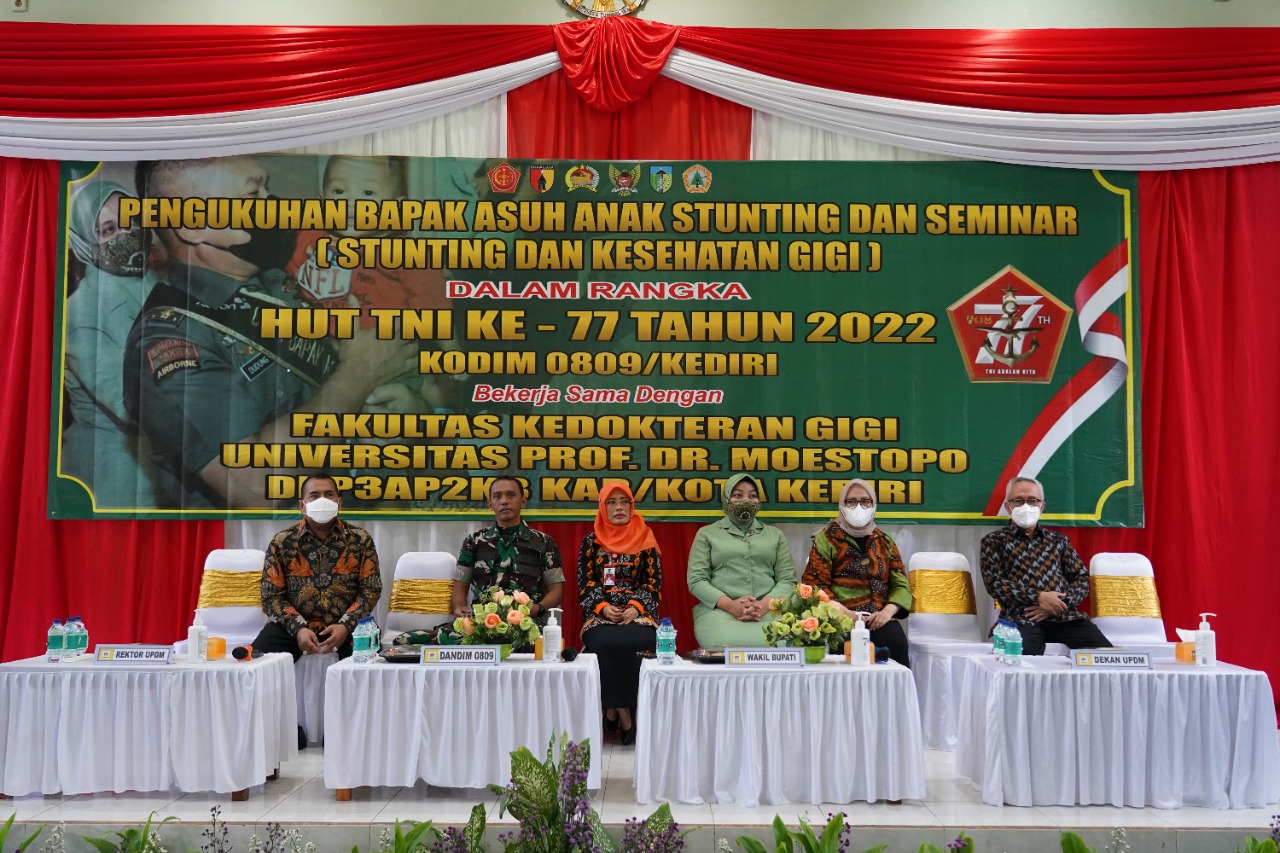 Tak berhenti sampai disitu, Kodim 0809/Kediri dan FKG Universitas Moestopo juga melakukan kolaborasi dengan DPP3AP2KB Kota/Kabupaten Kediri dengan menggelar seminar dan Pengukuhan Bapak Asuh Anak Stunting dan seminar tentang stunting dan kesehatan gizi.