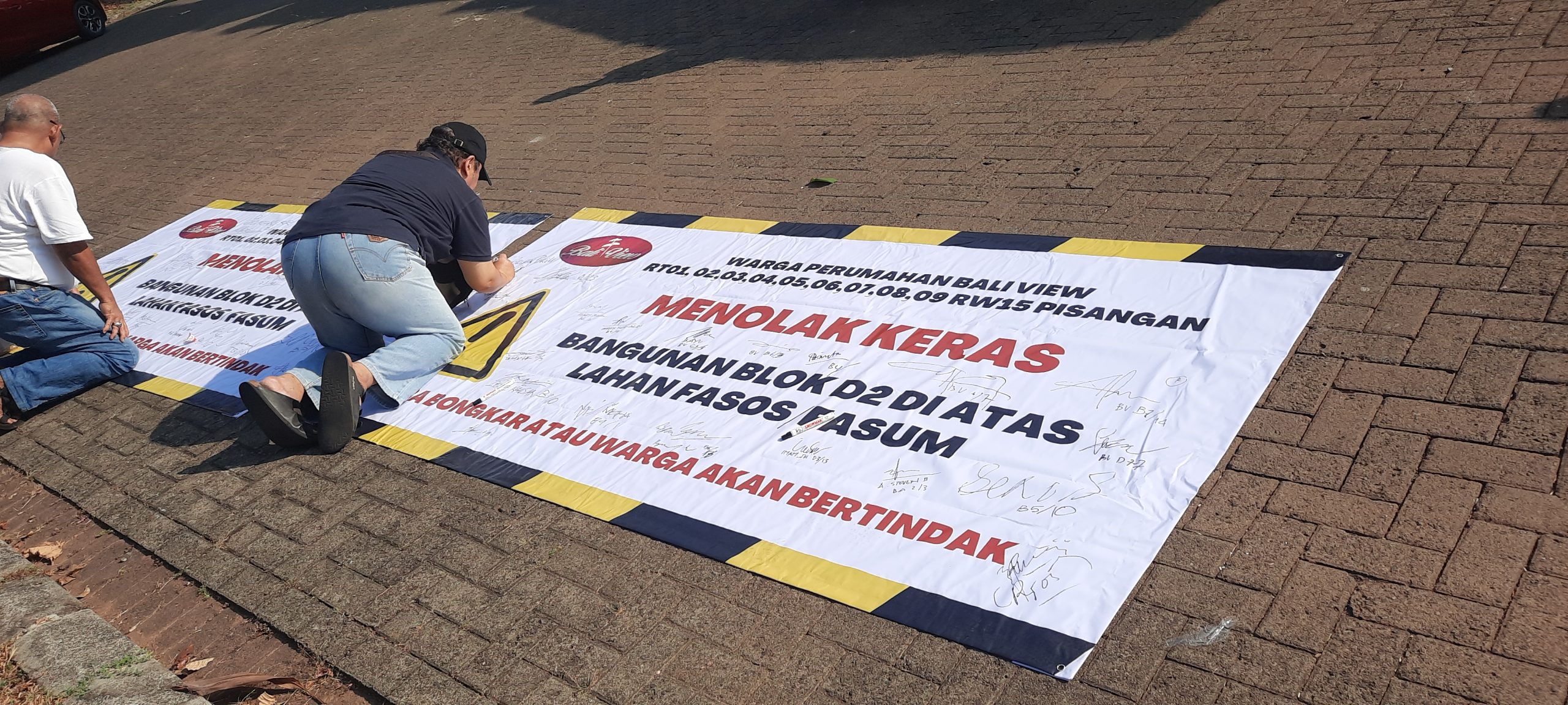 Dalam aksi warga yang dilakukan pada minggu 08 September 2024, menuntut agar pihak yang membangun di atas lahan Fasos dan Fasum segara membongkar dan mengembalikan fungsi fasos dan fasum sebagai sarana Ruang Terbuka Hijau (RTH).
