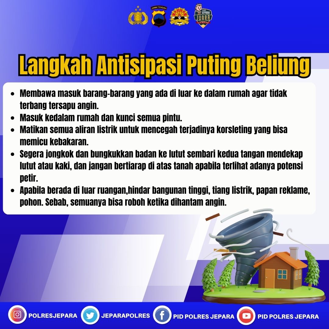 Terkait hal tersebut, Kapolres Jepara melalui Kasubsipenmas Sihumas Polres Jepara Ipda Puji Sri Utami mengimbau, kepada masyarakat tentang lima hal antisipasi angin puting beliung. Pertama, membawa masuk barang-barang yang ada diluar ke dalam rumah agar tidak terbang tersapu angin. Kedua, masuk kedalam rumah dan kunci semua pintu. Ketiga, matikan semua aliran listrik untuk mencegah terjadinya konsleting yang bisa memicu kebakaran.
